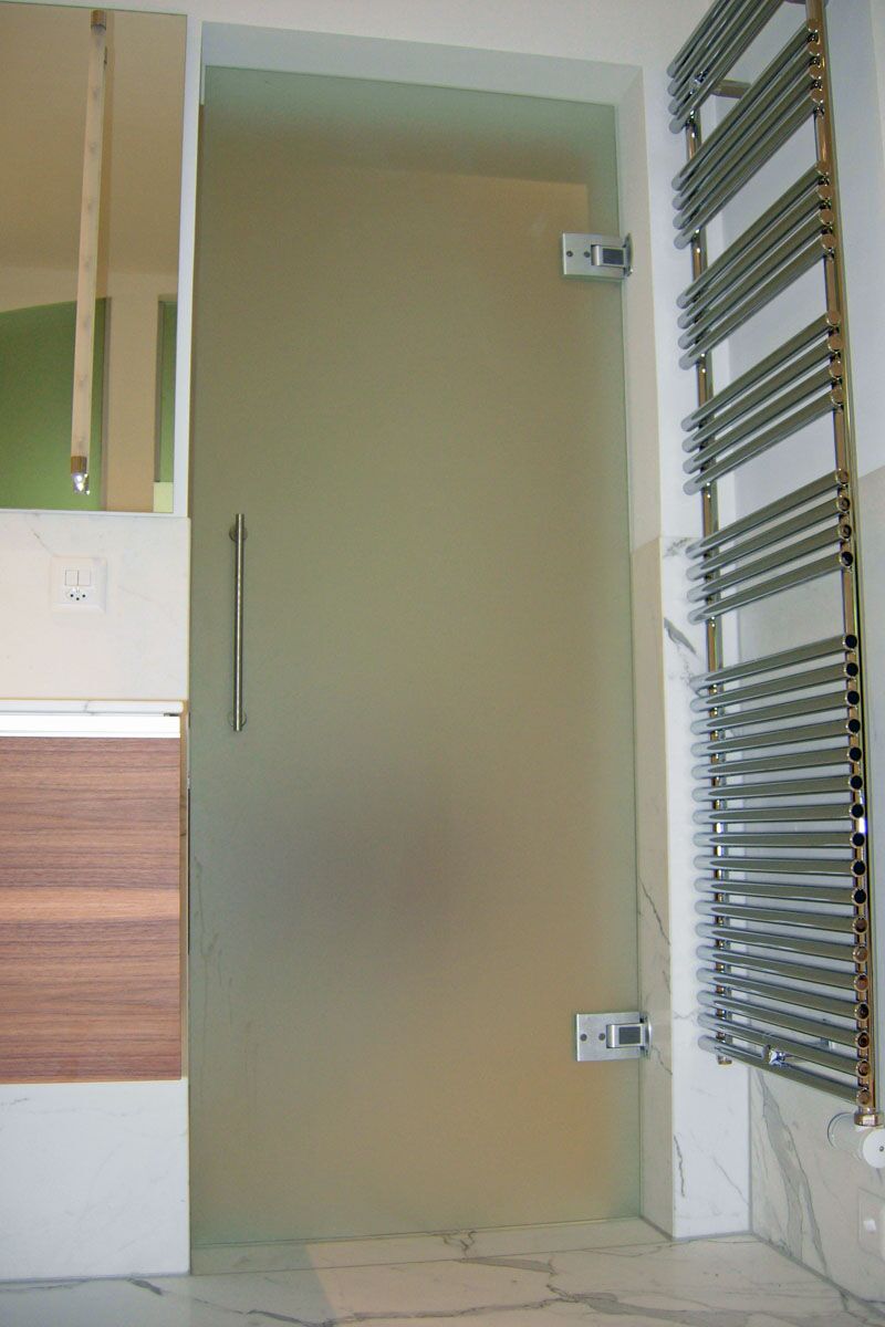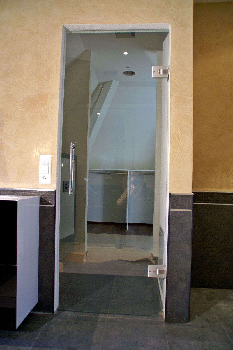 Ganzglasanlagen im Nassbereich können aus fest stehenden Glaselementen, sowie mit eingebauten Türen ausgeführt werden. Die Glasflächen können transparent sein oder mit partiellem Sichtschutz respektiv mit flächigem Sichtschutz versehen werden.