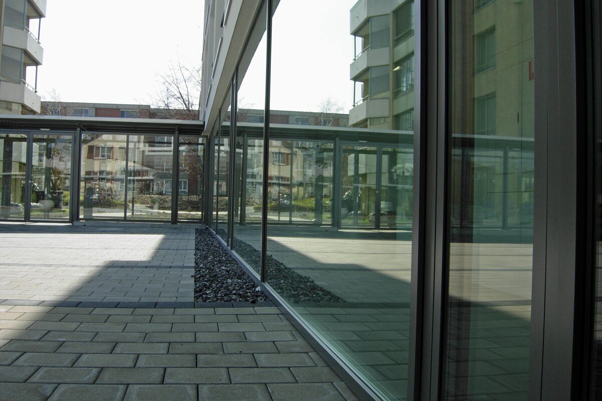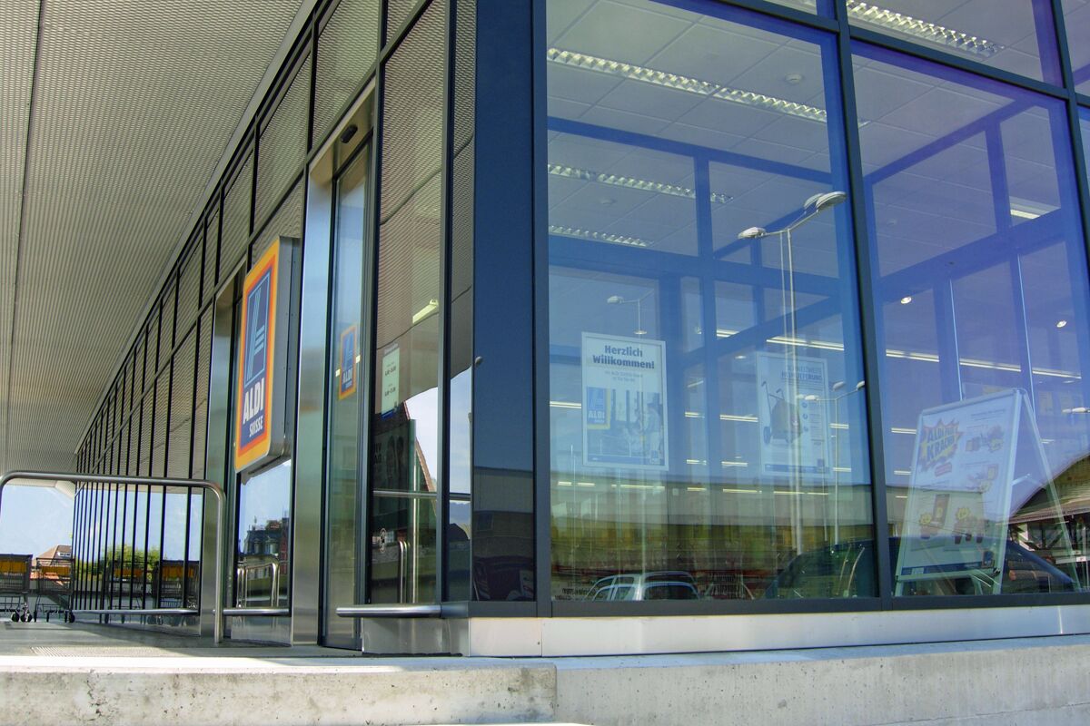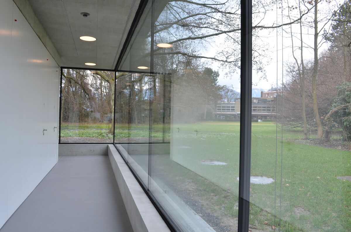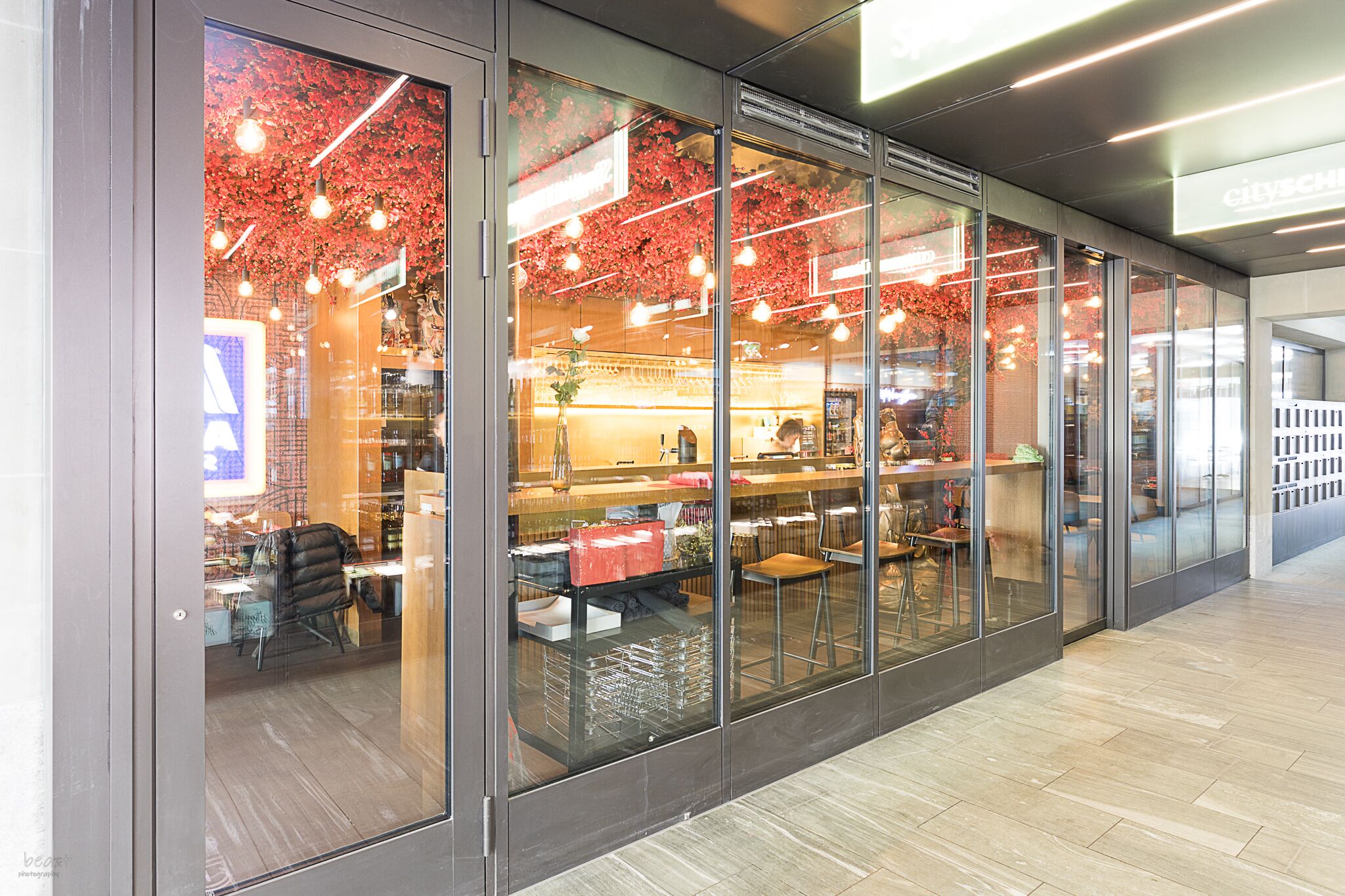 Pfosten-Riegelsystem als Eigenentwicklung, mit erhöhten ästhetischen Anforderungen. Die ebenfalls durch uns hergestellte, abgehängte Decke, fluchtet genau mit dem Fassadensystem.
