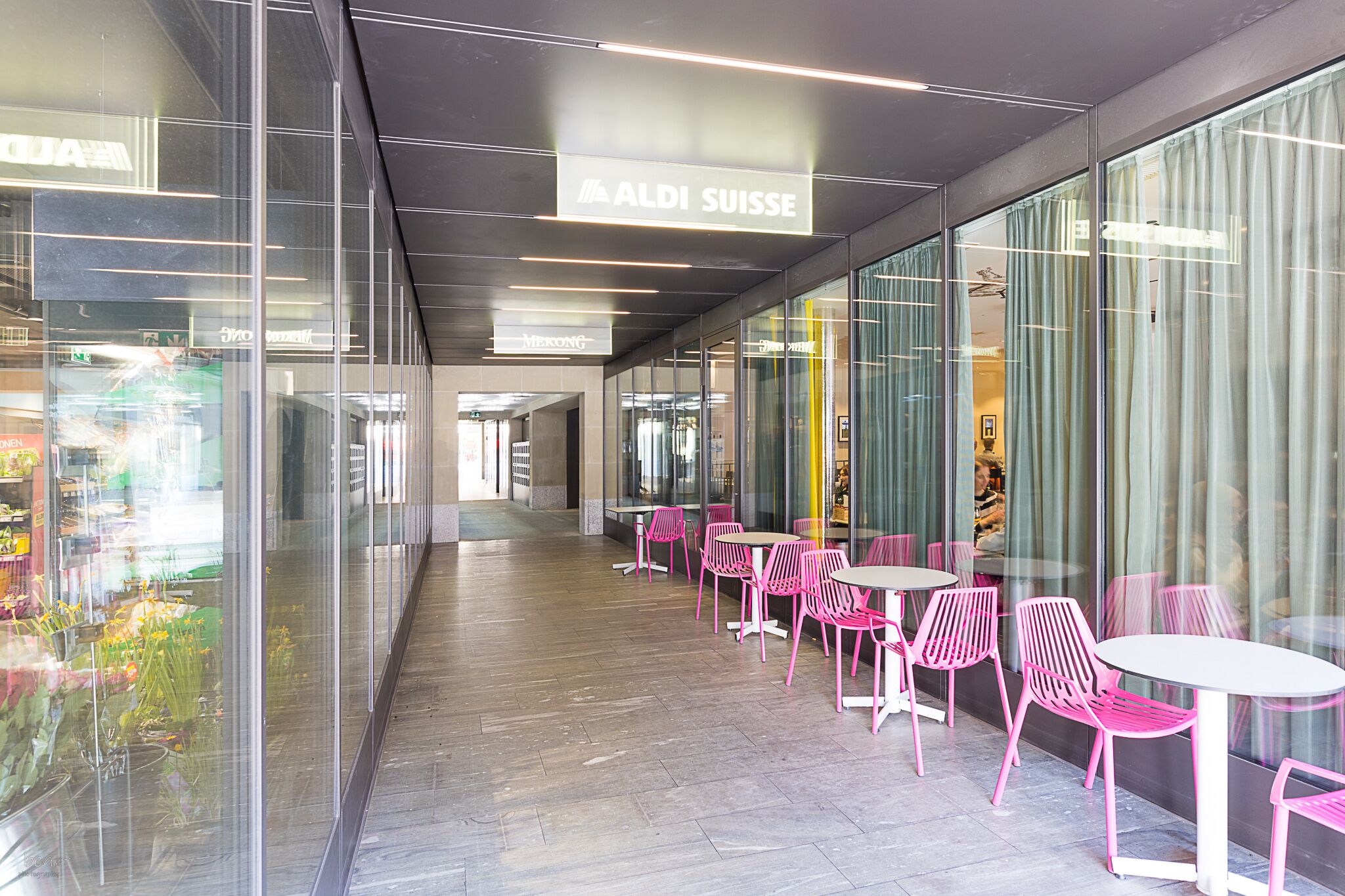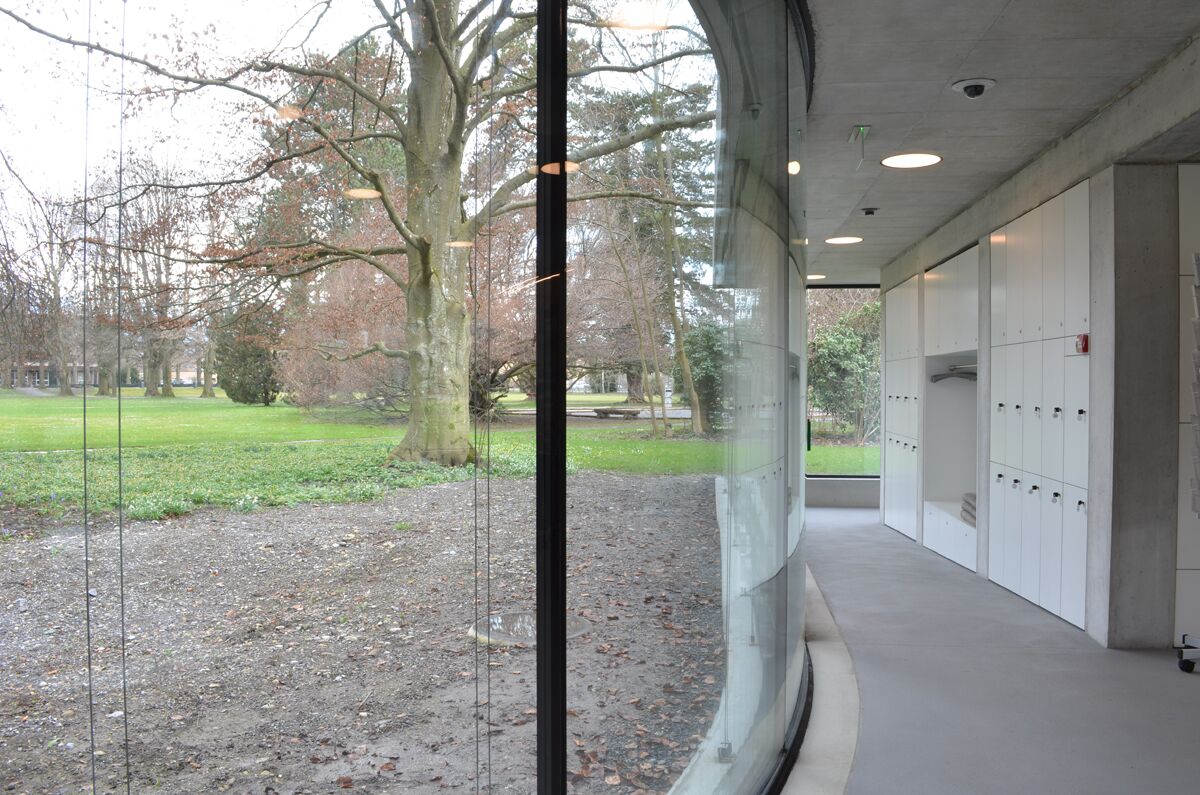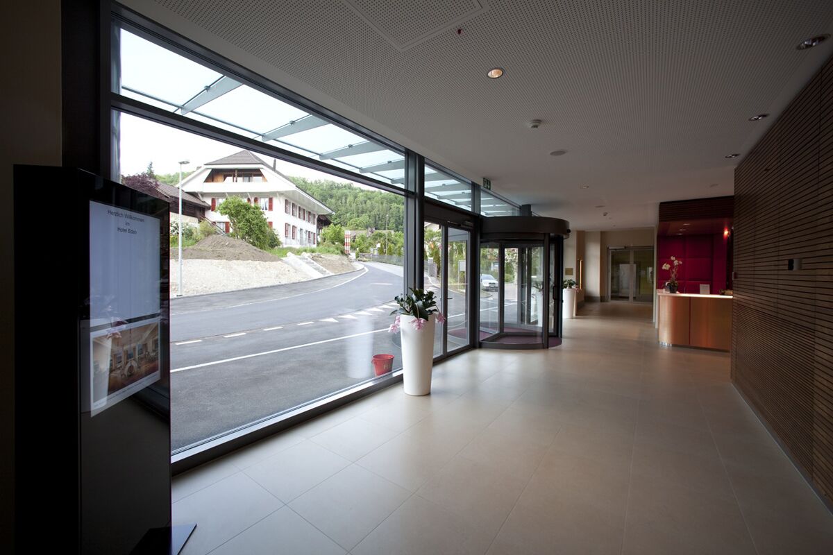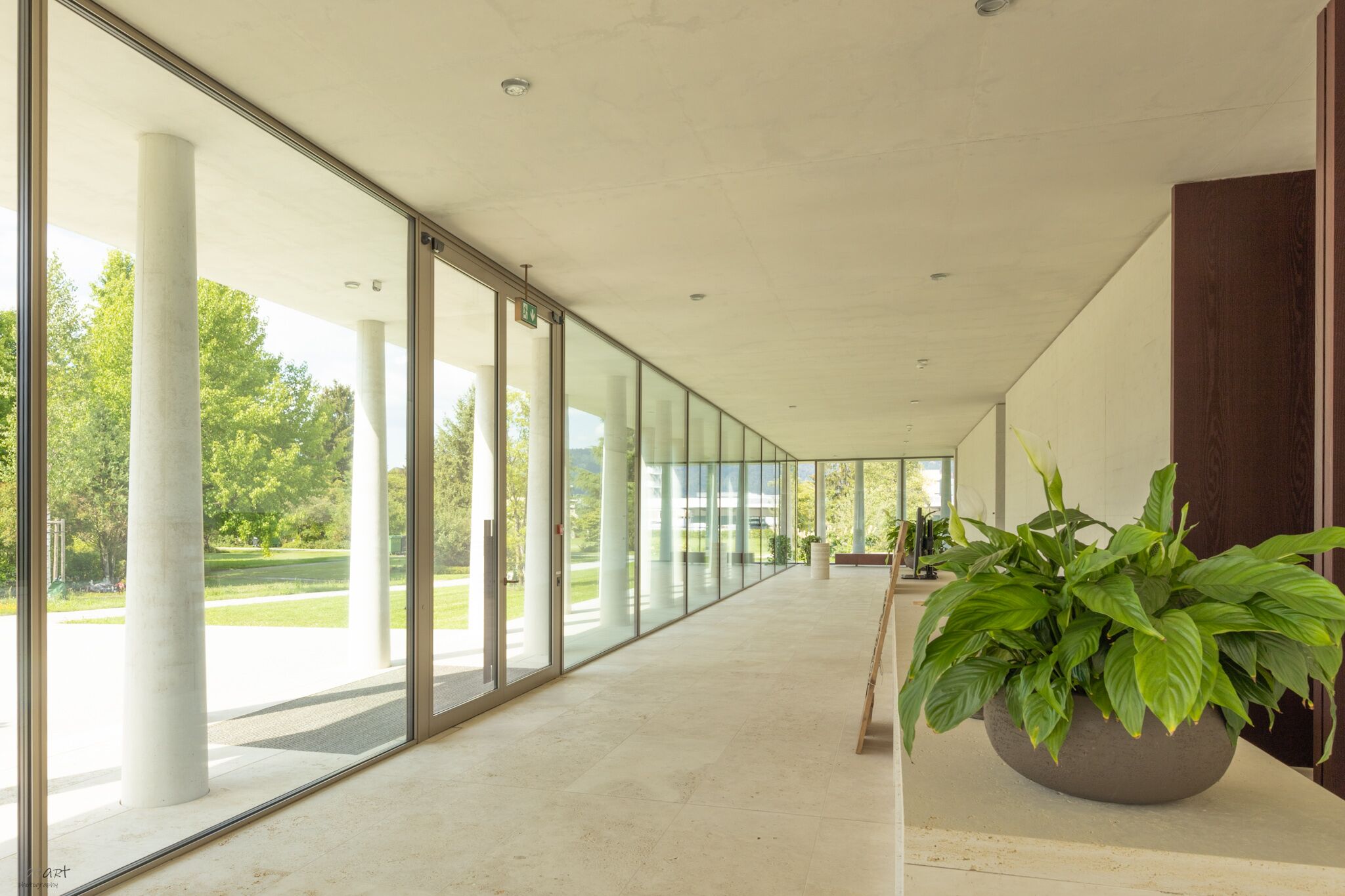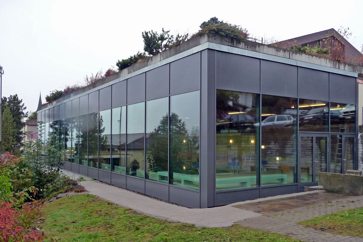 Pfosten-Riegelsystem als Eigenentwicklung, mit erhöhten ästhetischen Anforderungen. Die ebenfalls durch uns hergestellte, abgehängte Decke, fluchtet genau mit dem Fassadensystem.