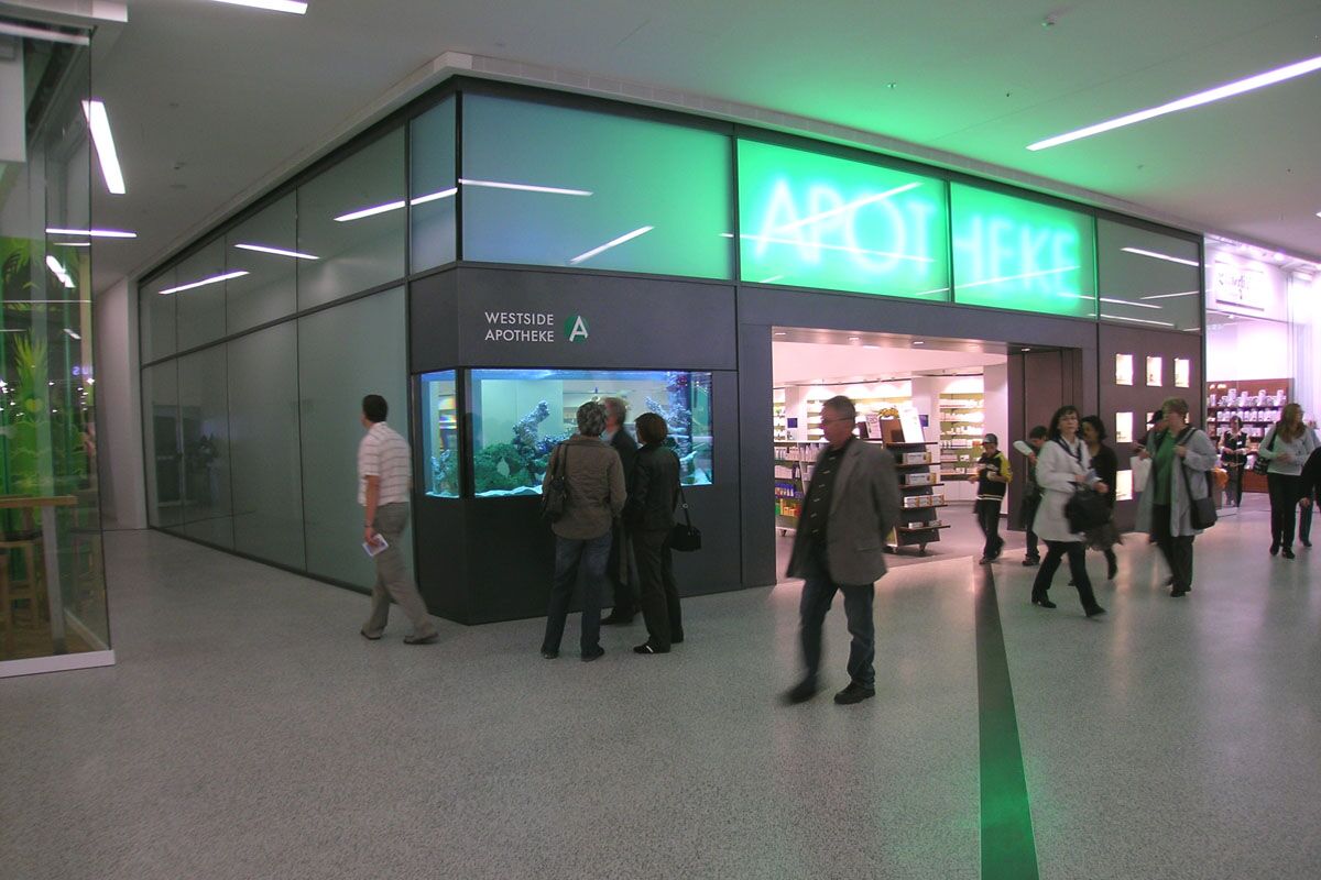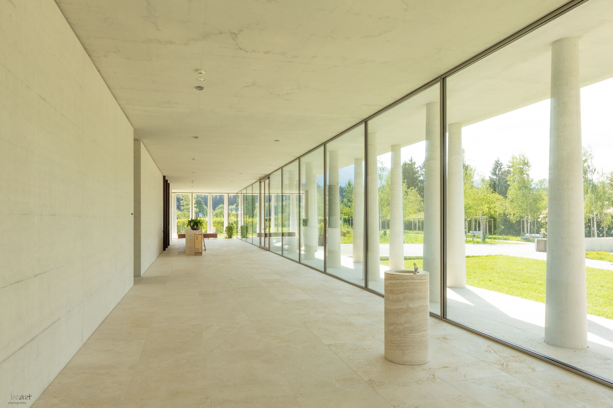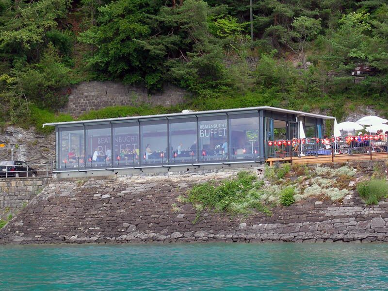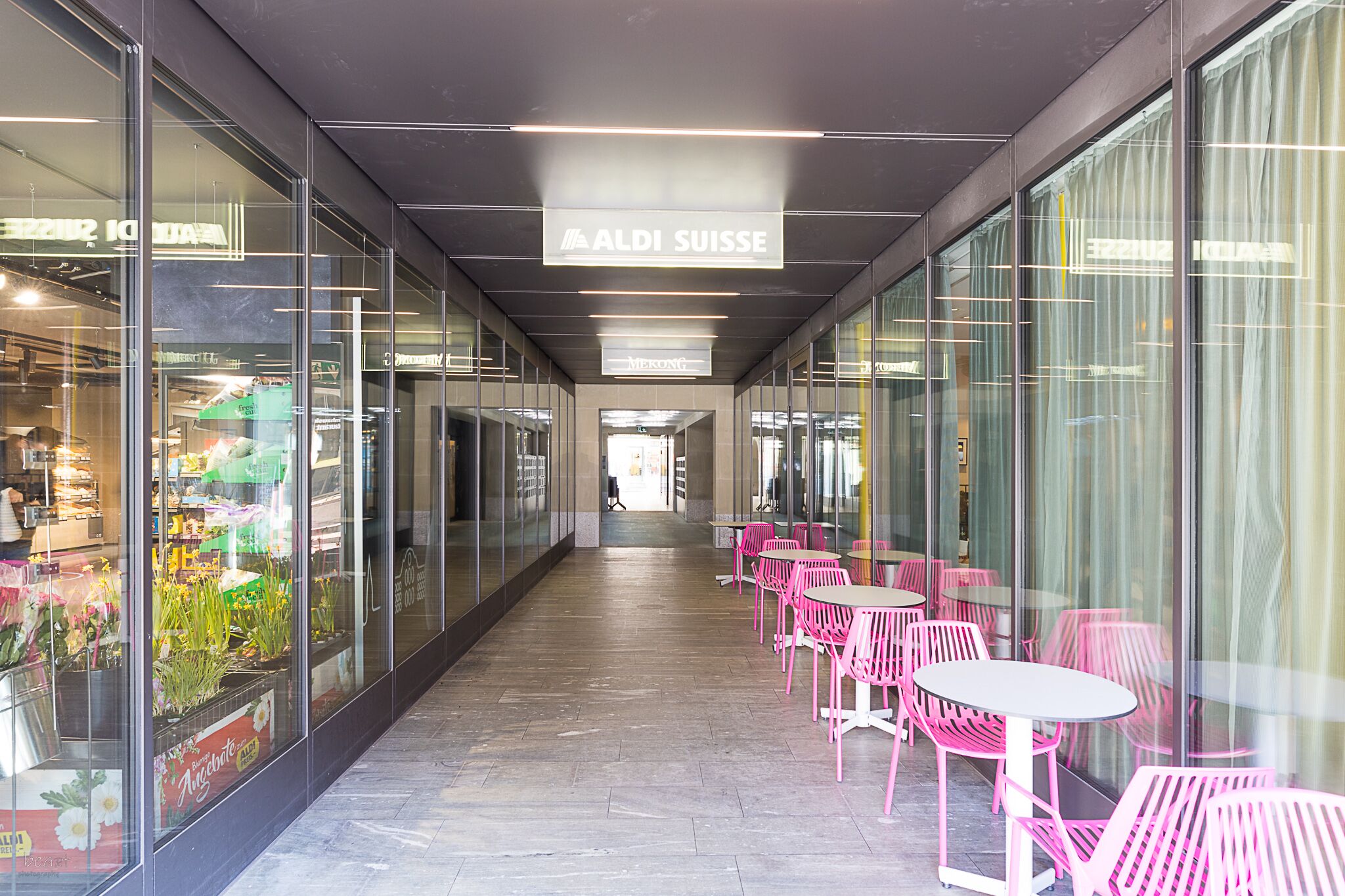 Pfosten-Riegelsystem als Eigenentwicklung, mit erhöhten ästhetischen Anforderungen. Die ebenfalls durch uns hergestellte, abgehängte Decke, fluchtet genau mit dem Fassadensystem.